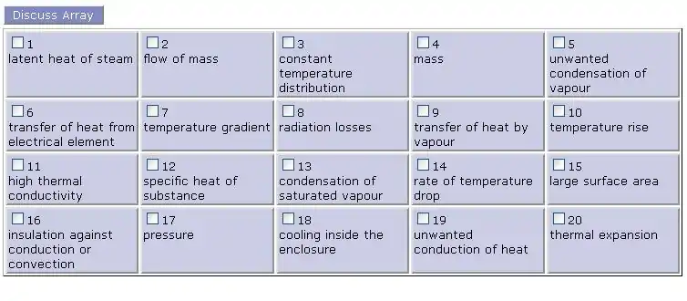 A randomized array of items which summarize key parts, concepts or principles from the knowledge base that is being used and studied in the exercise. Often it resembles a "key point summary" of the Presentation.