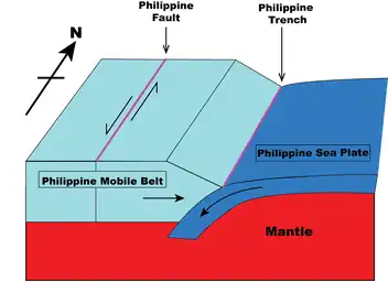 The Philippine Fault is a left-lateral strike-slip fault which cuts across the Philippine archipelago behind the subduction zone. It is a northwest–southeast trending fault, which aligns subparallel to the Philippine Trench, extends from northern Luzon to Mindanao.[4][1][6] It is influential in controlling the regional geodynamics and kinematics within the Philippine Trench system.[6]