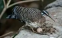 Sunbitterns start nesting in the early wet season and before it starts they make flight displays 10–15 m (33–49 ft) high in the forest canopy. They build open nests in trees, and lay two eggs with blotched markings. The young are precocial, but remain in the nest for several weeks after hatching.[3][11]