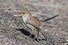 Shortly after the First Fleet's arrival at Port Jackson, Sydney, the bird gained the common name superb warbler.[7] In the 1920s came common names wren and wren-warbler—both from its similarity to the European wren—and fairywren.[8] The bird has also been called Mormon wren, a reference to observations of one blue-plumaged bird accompanied by many brown-plumaged birds, which were incorrectly assumed to be all female.[5] The Ngarrindjeri people of the Murray River and Coorong regions call it waatji pulyeri, meaning "little one of the waatji (lignum) bush",[9] and the Gunai call it deeydgun, meaning "little bird with long tail".[10] Both it and the variegated fairywren are known as muruduwin to the local Eora and Darug inhabitants of the Sydney basin.[11] Other alternative names for the superb fairywren include the Australian fairywren, blue wren, superb blue fairywren, and superb blue wren.