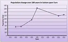The first census entry for Sutton upon Tern was made in 1921 where it had a total population of 512. This figure began to grow and by 1961 the population had tripled in size to 1,622 people.[15] This can be attributed to the introduction of the National Health Service in 1948 allowing widespread use of new antibiotics and the post-war National Food Policy.[16] All contributing to the post war baby boom. The population total has since peaked and has been slowly declining as shown in the most recent census of 2011.[17]