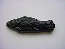 Salmiak-flavored black Swedish Fish or "salted herring", with the manufacturer's name "Malaco" embossed.
