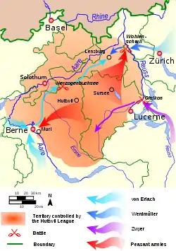On May 18, 1653, the peasants delivered ultimatums to Bern and Lucerne and raised 16,000 troops.[32] When the city of Bern replied with a protest note, the peasants marched to Bern under the leadership of Leuenberger, arriving on May 22, 1653. A second army led by Emmenegger laid siege to Lucerne. The city authorities were unprepared for an armed conflict and immediately engaged in negotiations. Within days, peace agreements were concluded. In the peace on the Murifeld (Murifeldfrieden, named after the field just outside Bern where the peasant army's camp lay) signed by Leuenberger and the mayor of Bern, Niklaus Dachselhofer, the city council of Bern promised on May 28, 1653, to fulfill the peasants' fiscal demands in return for the dissolution of the Huttwil League. In view of this development, the city of Lucerne and the besieging peasants agreed on a truce. Leuenberger's army lifted the siege of Bern and retreated, but the people refused to follow their leaders and objected to dissolving the Huttwil League.[33]