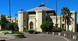 After Macquarie's return to Britain in 1821, the Stables had mixed uses. On 25 May 1825, Governor Thomas Brisbane suggested to Earl Bathurst that the 'Gothic Building on the pleasantest side of the Scite of the Domain, which was intended for a Government Stables, is utterly useless at present from the great disproportion of the Establishment of the Government, may be advantageously improved into a Government residence.'[17] On 30 June 1825, Earl Bathurst permitted Governor Ralph Darling to erect a new Government House or to convert the Stables into one though the estimates of costs would have to be sent to Britain for approval.[18] Late in 1825, Brisbane had loaned the stables to the Australian Agricultural Company to temporarily house its livestock after it arrived.[1]