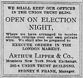 Frank served as team president of the Baltimore Orioles of the American League in 1901, their inaugural season.[2] John Mahon was elected to succeed Frank as chairman at the annual stockholders' meeting in February 1902.[3] Outside of baseball, Frank managed the brokerage firm of Arthur Lipper & Company, and his business obligations were cited as the reason that he did not continue as president of the Orioles.[3][4]