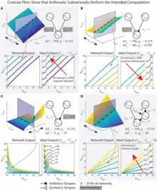 The physical structure of a division subnetwork is the same as a subtraction subnetwork except the inhibitory synapse is modulatory, rather than transmission. The division performed in this network follows the form below where the transmitted signal is divided by the modulating signal :