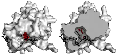 Surface model of TEV bound to uncleaved substrate (black), also showing the catalytic triad (red). The substrate binds inside an active site tunnel (left). A cutaway (right) shows the complementary shape of the binding tunnel to the substrate. (PDB: 1lvb)