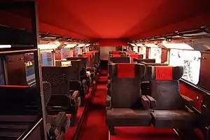 Starting in 2013, many of the Dasye trainsets have been reconfigured for use on SNCF's low-cost Ouigo service. These trains use a high-density layout, which can carry 20% more passengers (644 passengers, compared to 510 on a standard trainset). The extra seating is enabled by the elimination of the bar car and first-class cars, and the use of slimline seats.[7][8] By 2021, 38 Dasye trainsets have been converted for Ouigo service, with all 50 trainsets expected to be converted by 2025.[9]