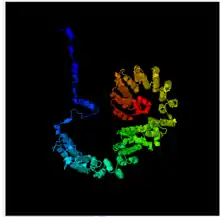 Predicted secondary structure of TMTC4. Starting at blue and going to red, the diagram illustrates the n-terminus through the c-terminus.