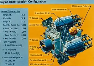 TRS was a design for an uncrewed robotic space tug designed to be capable of remote payload observation and boosting or de-orbiting another spacecraft. It was developed to potentially re-boost the Skylab space station to a higher orbit.[2] After Skylab 4, the third crewed mission to Skylab, plans were made to boost the station into a higher orbit to extend its service life or to de-orbit it into a remote ocean area.[3] A remotely controlled booster rocket was to be carried up in the Space Shuttle's third mission. Astronaut Jack R. Lousma described the remote booster as "as big as a truck" and requiring a control system able to match the circular motion of the Skylab docking port.[4] The core of TRS was a propulsion system that could accommodate additional fuel modules. It had a 24 nozzle 6-axis control thruster system to support Space rendezvous, docking, and orienting the spacecraft.[2]