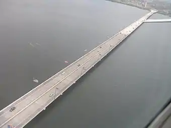 The Teodoro Moscoso Bridge is a bridge in Puerto Rico. It works as an extension of PR-17, also known as the Jesus T. Piñero Expressway, connecting this road with the Román Baldorioty de Castro Expressway (PR-26). It crosses the San José Lagoon thereby linking sectors of Rio Piedras in San Juan to Isla Verde Carolina neighbor. The bridge has become the new entrance to the Luis Muñoz Marín International Airport. It was opened on February 28, 1994 under the administration of Governor Pedro Rosselló, this construction being the first to be held under a Public Private Partnership in Puerto Rico.[2] The bridge consists of four lanes, electronic signs, a toll plaza with a fee of $3.65 in each direction,.[3] The bridge has flagpoles on both sides with alternating American and Puerto Rican flags, as of July 2019. The bridge accepts AutoExpreso, Puerto Rico's toll transponder system.[4]