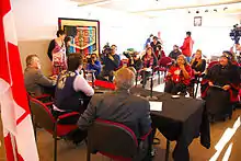 TTC Administration of Justice Press Conference. Then Chief of TTC Peter Johnston, with past Yukon Premier Dennis Fentie and Canadian Federal Minister for Indian and Northern Affairs, John Duncan at the Teslin Tlingit Heritage Centre, Teslin, Yukon.