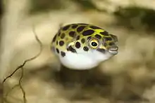 Dichotomyctere nigroviridis (syn. Tetraodon nigroviridis) is one of the pufferfish known as the green spotted puffer. It is found across South and Southeast Asia in coastal freshwater, but survives the longest in brackish to saltwater, and brackish water habitats.[2] D. nigroviridis reaches a typical maximum length of about 15 cm (6 in) (5.9 in), with reports of up to 17 cm (6.7 in).[3] In February 2009, it was successfully bred in captivity at University of Florida using a new variation of the ovarian lavage technique.[4]