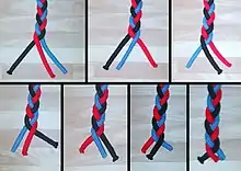 Fiber is the smallest component of a fabric; fibers are typically spun into yarn, and yarns are used to manufacture fabrics.[8][7] Fiber has a hair-like appearance and a higher length-to-width ratio. The sources of fibers may be natural, synthetic, or both. The techniques of felting and bonding directly transform fibers into fabric. In other cases, yarns are manipulated with different fabric manufacturing systems to produce various fabric constructions. The fibers are twisted or laid out to make a long, continuous strand of yarn.[2] Yarns are then used to make different kinds of fabric by weaving, knitting, crocheting, knotting, tatting, or braiding.[9][10][5] After manufacturing, textile materials are processed and finished to add value, such as aesthetics, physical characteristics, and increased usefulness.[11] The manufacturing of textiles is the oldest industrial art.[12] Dyeing, printing, and embroidery are all different decorative arts applied to textile materials.[13]
