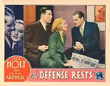 The Defense Rests (or Take the Witness) is a 1934 American film directed by Lambert Hillyer[1] and starring Jack Holt, Jean Arthur,[2] and Nat Pendleton. The movie was produced in May 1934 and released on 15 July 1934.[3][4][5][6]