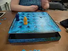 The game has a wizard setting and is played over a 6x6 rectangular grid representing a labyrinth. The labyrinth's walls are actually placed under the board, invisible to the players. The player's pieces consist of a wizard piece on top of the board, and a metal sphere underneath the board, connected to the wizard piece by a magnet.[2] The pieces start out from the four corners of the board, with one player in each corner.[3]
