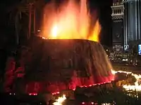 In 2005, the design firm WET was hired to begin planning an upgrade of the volcano.[56][58] The company spent two years developing a fire-shooting device for the revamped volcano.[139] It closed in February 2008, to allow for the $25 million upgrade to take place.[140] The volcanic structure, made of steel, was stripped down to receive a new exterior.[141] It reopened at the end of the year. The improved volcano shoots water 12 feet (3.7 m) high, while 120 flamethrower devices spout out flames on the lagoon. The attraction is choreographed to music by Mickey Hart and Zakir Hussain.[142][143] WET's redesign was inspired by the Fountains of Bellagio, another choreographed attraction by the company.[139]