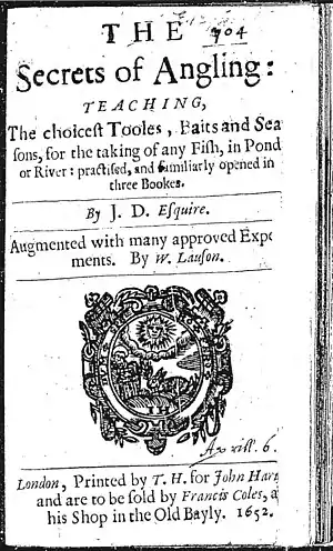 First published in 1613,[1][2] Dennys's book was published after his death.[nb 1] The author was identified by the initials J.D., and had been attributed to up to 6 poets. In 1811 the authorship was determined from a "23mo Martii, 1612" (i.e., 1613) entry in the Stationers' Registers, which showed that Dennys authored the book.[3] The Secrets of Angling was published in 4 editions, the last in 1652, and copies are amongst the rarest books in existence.[2][nb 2]