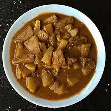 Theeyal (pronounced [t̪iːjal]) is a South Indian dish originating from the Indian state of Kerala. It has a soupy consistency, and is made from a mixture of spices consisting of roasted coconut, coriander seeds, dried red chili and fenugreek. All spices are ground to a paste and cooked in tamarind water with vegetables. When completed it looks like a rich medium brown gravy and is normally served with rice.[1]