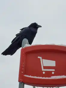 A large raven sitting on a shopping-cart-return-rack. Taken in Thompson, Manitoba, near the City Centre Mall (containing a Walmart and a Safeway), where a large number of ravens gather every day.