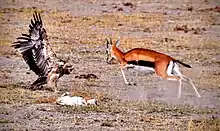 Thomson's gazelles are dependent on short grass.[18] Their numbers can be highly concentrated at the beginning of the rains when the grass grows quickly.[18] In the Serengeti, they follow the larger herbivores, such as plains zebras and blue wildebeests as they mow down the taller grasses.[18] In the wild, Thomson's gazelles can live 10–15 years. Their major predators are cheetahs, which are able to attain higher speeds, but gazelles can outlast them in long chases and are able to make turns more quickly.[19] This small antelope can run extremely fast, up to 80 km/h (50 mph),[20] and zigzag, an adaptation which often saves it from predators. Sometimes, they are also taken by leopards, lions, African wild dogs, hyenas, Nile crocodiles and African rock pythons, and their fawns are sometimes the prey of eagles, jackals, and baboons. A noticeable behaviour of Thomson's gazelles is their bounding leap, known as stotting or pronking, used to startle predators and display strength.