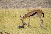 A male gazelle follows a female and sniffs her urine to find out if she is in estrus, a process known as the Flehmen response.[24] If so, he continues to court and mount her.[23] Females leave the herd to give birth to single fawns after a five- to six-month gestation period.[25] Birthing predominantly occurs after the rainy season, with newborn fawns weighing 2 to 3 kg (4.4 to 6.6 lb).[26] They give birth twice yearly with one or two fawns.[18] When giving birth, a female gazelle crouches as the newborn fawn drops to the ground, tearing the umbilical cord.[27] The mother then licks the fawn clean of amniotic fluid and tissues.[27] In addition, licking possibly also serves to stimulate the fawn's blood circulation, or to "label" it so its mother can recognize it by scent.[27]