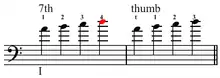In thumb position, the, "'standard' finger pattern," between the thumb, first and second fingers, is whole, whole, and half tone.[2] Thus if the thumb is placed on A, the index and middle fingers are placed on B and C#.
