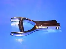 A ticket punch (or control nippers) is a hand tool for permanently marking admission tickets and similar items of paper or card stock. It makes a perforation and a corresponding chad. A ticket punch resembles a hole punch, differing in that the ticket punch has a longer jaw (or "reach") and the option of having a distinctive die shape. A ticket punch resembles a needle punch in that it makes a distinctive pattern in the item punched, but differs in that it makes a chad.