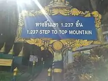 The Tiger Cave Temple (Thai: วัดถ้ำเสือ, RTGS: wat tham suea) is a Buddhist temple north-northeast of Krabi, Thailand. A sacred site, it is known for the tiger paw prints in the cave, tall Buddha statues and the strenuous flight of stairs to reach the summit.[1]