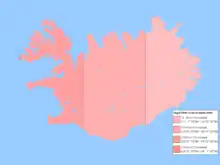This map shows the difference between legal time and local mean time in Iceland. Iceland is significantly ahead of local solar time as it observes UTC±00:00 instead of the geographical UTC−01:00 or UTC−02:00.