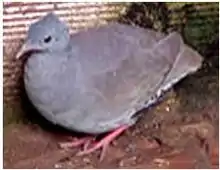 Tinamous are plump, compact birds with slender necks, small heads and, usually, short, decurved bills, though a few have long bills. Females are usually larger than the males.[26] The smallest species, the dwarf tinamou, weighs about 43 g (1.5 oz) with a length of 14.5 cm (5.7 in).[8] Females of the largest, the grey tinamou, weigh up to 2 kg (4.4 lb) with a length of up to 49 cm (19 in).[26] Their feet have three forward-facing toes; a hind toe is either higher and retrogressed, or absent. The back of the tarsus is covered with scales, the color of which may aid in identification.[27]