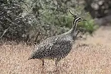 The plumage of the family is cryptic, as is usual with ground birds, with typical colors ranging through dark brown, rufous, buff, yellow and grey. Plumage does not usually differ between sexes, but in a few species females are brighter.[7] The forest dwellers tend to be darker and more uniform, whereas the steppe species are paler with more barring, speckling, or streaking.[8] Tinamous have well-developed powder down feathers; these grow continuously and disintegrate at the tips into a powder that is spread through the rest of the feathers by preening. This gives the plumage a glossy appearance as well as waterproofing it. Their tails are short, sometimes hidden behind the coverts, and possibly indicative of an ability to sacrifice feathers to a predator in order to escape when grasped.[8] Some tinamous have crests. Members of Eudromia have the most developed crests and, when excited, will direct them forward.[8]