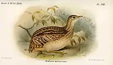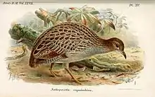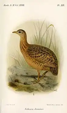 Nothurine fossils referrable to Eudromia and Nothura have been found in the Late Miocene Cerro Azul Formation from the Pampean region of central-southern Argentina.[18] Tinamous described from Pliocene material include Eudromia olsoni Tambussi & Tonni, 1985, Nothura parvulus Rovereto, 1914, and Nothura padulosa Mercerat, 1897.[14] The Pliocene fossil genera Cayetornis Brodkorb and Tinamisornis Rovereto have been synonymized with Nothura and Eudromia respectively.[19] Fossils having affinities with several extant genera have been found in Pleistocene deposits.[17]