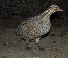Tinamous (/ˈtɪnəmz/) form an order of birds called Tinamiformes (/ˌtɪnəməˈfɔːrmz/), comprising a single family called Tinamidae (/təˈnæməd/), divided into two distinct subfamilies, containing 46 species found in Mexico, Central America, and South America. The word "tinamou" comes from the Galibi term for these birds, tinamu.[2] Tinamous have traditionally been regarded as the sister group of the flightless ratites, but recent work places them well within the ratite radiation, implying basal ratites could fly.[3] Tinamous first appear in the fossil record in the Miocene epoch. They are generally sedentary, ground-dwelling and, though not flightless, when possible avoid flight in favour of hiding or running away from danger. They are found in a variety of habitats, ranging from semi-arid alpine grasslands to tropical rainforests. The two subfamilies are broadly divided by habitat, with the Nothurinae referred to as steppe or open country tinamous, and the Tinaminae known as forest tinamous.