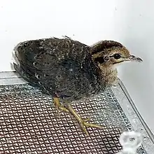 Chicks hatch synchronously with a dense downy coat. The coloring is white, grey or yellow, with dark spots to aid in camouflage.[8] The young are precocial, and can run almost as soon as they hatch. Soon after hatching the eggs, the male will leave the nest and call the chicks to him with a soft contact call. If threatened, he will freeze and attempt to hide the chicks under his wings or belly. There have been documented cases of females caring for the young; it is thought that this occurs when the male has been killed.[27] Young chicks can feed themselves within the first few days, but the male will bring the food and drop it on the ground in front of them. The chicks have a high initial mortality rate. However, within a few days they are chasing insects on their own and, at 1–3 weeks, they can fly to branches a metre from the ground.[8] They are self-sufficient within 20 days.[7]