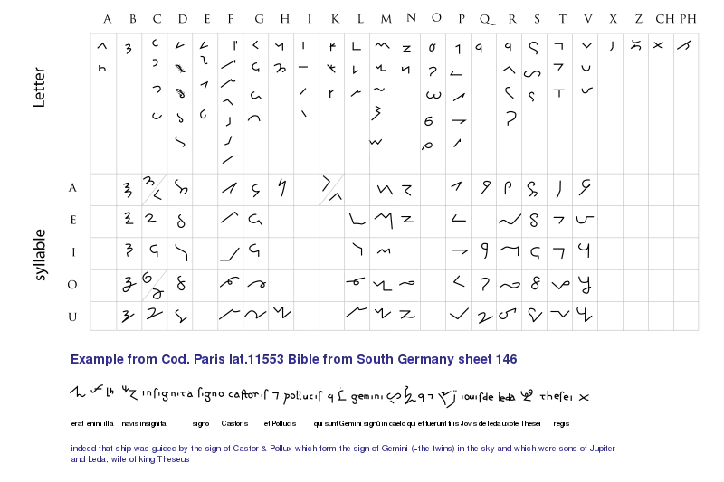 - Karl Eberhard Henke: Über Tironische Noten Manuscript B 16 of the Bibliothek der Monumenta Germaniae Historica, c. 1960 (German) (See 33. within for examples of composite Tironian notes.)