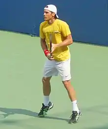 Thomas Mario Haas (German pronunciation: [ˈtɔmi ˈhaːs]; born 3 April 1978) is a German former professional tennis player. He competed on the ATP Tour from 1996 to 2017. After breaking into the world top 100 in 1997 and reaching a career-high singles ranking of world No. 2 in May 2002, his career was interrupted by injuries: Haas twice dropped out of the world rankings due to being unable to play for twelve months.[1] His first period of injury saw him miss the whole of the 2003 season, and he did not return to the world's top 10 until 2007. He also was absent between February 2010 and June 2011, but returned to world No. 11 in 2013 by reaching the quarterfinals at the French Open for the first time. Haas reached the semifinals of the Australian Open three times, and in Wimbledon once. He reached the quarterfinal stage of each of the major events. He won 15 career titles in singles, including a Masters title at the 2001 Stuttgart Masters, and a silver medal from the 2000 Summer Olympics.