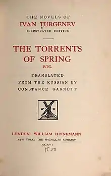 1. Turgenev, Ivan Sergeevich (1897). The torrents of spring. The Novels of Ivan Turgenev. Vol. ix. Translated by Constance Garnett. New York: Macmillan.
