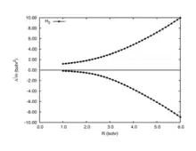 When the total position-spread tensor is partitioned according to spin (spin-partitioned total position-spread), it becomes a powerful tool to describe spin delocalization in the insulating regime. In Figure 4 is shown the longitudinal spin-partitioned total position-spread (Λ∥) computed at full configuration interaction level for the H2 diatomic molecule. The horizontal line at 0 bohr2 divides the same spin (positive values) and different spin (negative values) contributions of the spin partitioned total position-spread. Unlike the spin-summed total position-spread that saturates to the atomic value for R>5, the spin-partitioned total position-spread diverges as R2 indicating that there is a strong spin delocalization. The spin-partitioned total position-spread can also be seen as a measure of how strong the electron correlation is.