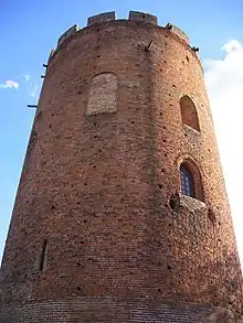 The Tower of Kamyenyets (Belarusian: Камянецкая вежа; Russian: Каменецкая башня), also called the White Tower (Belarusian: Белая вежа, romanized: Bielaya vieža), is the main landmark of the town of Kamyenyets in Belarus. The name Bielaja Vieža (alternative transliteration: Belaya Vezha), which literally means White Tower or White Fortress in Belarusian, presumably derives from the tower's proximity to the Belavezhskaya Pushcha Forest, but not from its color, which has been brick-red through the ages, never white.[1]