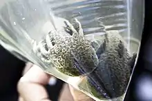 These remaining canals and their ecosystem was declared a World Heritage Site in 1987, with the purpose of saving them.[22] An important part of this ecosystem is a willow tree called a “ahuejote” that is native to the shallow waters of the lake/canals. These stem erosion, act as wind breakers and favor the reproduction of a variety of aquatic species.[16] Some of these endemic species include a freshwater crayfish called an acocil, and the Montezuma frog.[16][20] However, the most representative animal from these waters is the axolotl (Ambystoma mexicanum). This amphibian was used as a medicine, food and ceremonial object during the Aztec Empire. It was considered to be an incarnation of the god Xolotl, brother of Quetzalcoatl. It has been studied due to its abilities to regenerate limbs and other body parts. It can also reach sexual maturity as a larva, which no other amphibian can do. While mostly aquatic, it does have limited ability to breathe air.[23] As of 2003, there were only 600 axolotls known to exist in the wild.[22] Most of the threat to the species is loss of habitat and pollution, but the introduction of non-native fish such as tilapia has also had disastrous effects on the population of this and other species.[22] Conservation efforts include research and environmental education.[23] The Grupo de Investigación del Ajolote en Xochimilco (GIA-X) is a nonprofit research group dedicated to the preservation of the axolotl, which is in danger of extinction. It works to better understand the creature as well as with the local community to protect what is left of its habitat.[24] In addition to species that live in the area year round, the wetlands here host about forty percent of the migratory bird species that arrive to Mexico, roughly 350, use the wet areas around Xochimilco for nesting. Many of these come from the United States and Canada. However, much of this habitat has been urbanized. About 700 species have been found in the area overall. Some of the migratory species include pelicans, storks, buzzards and falcons.[25]