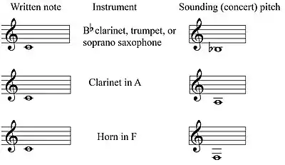 Instruments that transpose this way are often said to be in a certain "key" (e.g., the "B♭ clarinet" or "clarinet in B♭"). This refers to the concert pitch that is heard when a written C is played on the instrument in question. Playing a written C produces a concert B♭ on a B♭ clarinet, a concert A on an A clarinet, and a concert C on a C clarinet (this last example is a non-transposing instrument).
