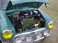 After the Second World War, Saab used the configuration in their first model, the Saab 92, in 1947.[3] The arrangement was also used for Borgward's Goliath and Hansa brand cars. The East German-built Trabant, which appeared in 1957, also had a transverse mounted two stroke engine, and this design was kept until the end of production, in 1991. However, it was with Alec Issigonis's Mini, introduced by the British Motor Corporation in 1959, that the design gained acclaim. Issigonis incorporated the car's transmission into the engine's sump, producing a drivetrain unit narrow enough to install transversely in a car only 4 feet (1.2 m) wide. While previous DKW and Saab cars used small, unrefined air-cooled two-stroke engines with poor performance, the gearbox-in-sump arrangement meant that an 848 cc four-cylinder water-cooled engine could be fitted to the Mini, providing strong performance for a car of its size. Coupled to the much greater amount of interior space afforded by the layout (the entire drivetrain only took up 20% of the car's length), this made the Mini a genuine alternative to the conventional small family car.