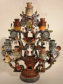 A Tree of Life (Spanish: Árbol de la vida) is a type of Mexican pottery sculpture traditional in central Mexico, especially in the municipality of State of Mexico. Originally the sculptures depicted the Biblical story of creation, as an aid for teaching it to natives in the early colonial period. The fashioning of the trees in a terracotta sculpture began in Izúcar de Matamoros, Puebla but today the craft is most closely identified with Metepec.[1] Traditionally, these sculptures are supposed to consist of certain biblical images, such as Adam and Eve, but recently there have been trees created with themes completely unrelated to the Bible.[2]
