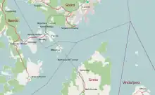 Bømla Bridge is a suspension bridge which crosses Spissøysundet, connecting Spissøy and Nautøya. It is 998 meters (3,274 ft) long and has a main span of 577 meters (1,893 ft). The bridge is 13 meters (43 ft) wide and has a clearance of 36 meters (118 ft). The higher clearance was built to allow ship traffic which runs through Nyleia between Bømlo and Stord to continue to run. The bridge has two 105-meter (344 ft) tall pylons, one foundationed on Brunsholmen and one on Spissøy. The bridge has a similar aesthetically design to the Stord Bridge, and also features a steel deck with concrete pylons.[6] It has the fifth-longest span in Norway.[4] Spissøy Bridge is a beam bridge which crosses Gassasundet, connecting Bømlo with Spissøy. It is 283 meters (928 ft) long, consists of five spans and has a clearance of 7 meters (23 ft).[6]