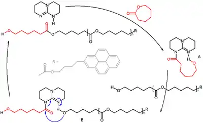- ↑ Reaction specs: initiator 4-pyrenebutanol (pyrene enables end-group determination by UV–vis) and monomer caprolactone added in ratio 1:100, targeted degree of polymerization = 100, with TBD cat. 0.5% in benzene; 72% conversion in 8 hours; polydispersity index 1.16