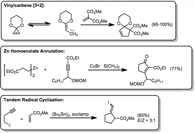 Although 1,3-dipolar cycloaddition is a useful method for the generation of five-membered heterocyclic compounds, few methods exist to synthesize five-membered carbocyclic rings in a single step via annulation. Most of these, like TMM cycloaddition, rely on the generation of a suitable three-atom component for combination with a stable two-atom partner such as an alkene or alkyne. When heated, cyclopropene acetals rearrange to vinylcarbenes, which can serve as the three-atom component in cycloadditions with highly electron-deficient alkenes.[18] Zinc homoenolates can also serve as indirect three-atom components, and undergo cyclization to cyclopentenones in the presence of an unsaturated ester.[19] Tandem intermolecular-intramolecular cyclization of homopropargylic radicals leads to methylenecyclopropanes.[20]