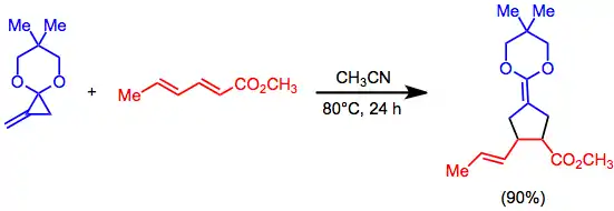 When stabilizing groups are present, MCPs may open to the corresponding zwitterionic TMMs.[7] Acetal 1 has been used in this context, and provides cyclopentanes with the acetal functionality exo to the newly formed ring with high selectivity. This reaction is also stereospecific with respect to alkene geometry, and exhibits high selectivity for endo products in most cases.