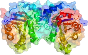 Triose phosphate isomerase is a dimer of identical subunits, each of which is made up of about 250 amino acid residues. The three-dimensional structure of a subunit contains eight α-helices on the outside and eight parallel β-strands on the inside. In the illustration, the ribbon backbone of each subunit is colored in blue to red from N-terminus to C-terminus. This structural motif is called an αβ-barrel, or a TIM-barrel, and is by far the most commonly observed protein fold. The active site of this enzyme is in the center of the barrel. A glutamic acid residue and a histidine are involved in the catalytic mechanism. The sequence around the active site residues is conserved in all known triose phosphate isomerases.