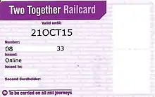 The Two Together Railcard is a scheme which gives discounts on certain types of railway ticket in Britain. Launched nationally in 2014 after a successful trial in 2011–12,[1] it was the first new Railcard scheme since the 1980s. It is available to any two named individuals aged 16 or over and is priced at £30.00 (as of 2024). There is no restriction on the number of times the Railcard can be used to purchase discounted tickets during the period of its validity, and there are no geographical restrictions on its use.[2]
